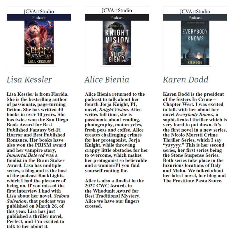 Hello and welcome to my new newsletter. I will be going back into the 2022 podcast vault and featuring authors who have come on the podcast. If I haven't featured you yet, I will. All podcasts can be found at www.jcvartstudio.net or click the button below.